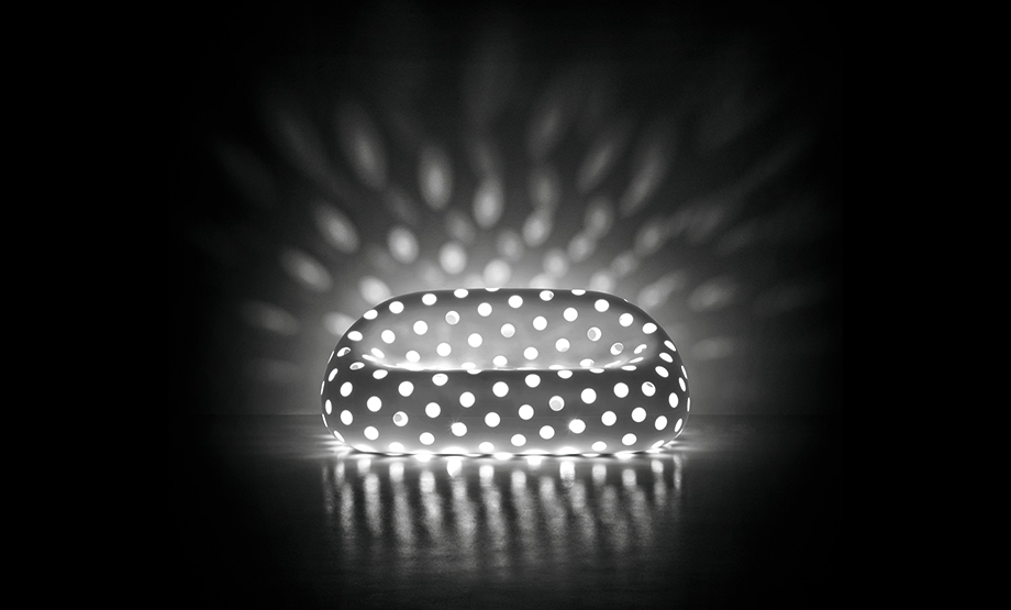 La superficie, in materiale opaco, forata “svuota” gli oggetti e conferisce una leggerezza inedita per questa tipologia di arredi. È possibile utilizzare due kit luce RGB che grazie alla gamma colori variabile, permettono di ottenere effetti cromatici dal forte impatto emozionale.