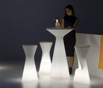 Tavolo alto Fade di Plust in polietilene colorato, ben si presta ad essere affiancato agli arredi della stessa famiglia.