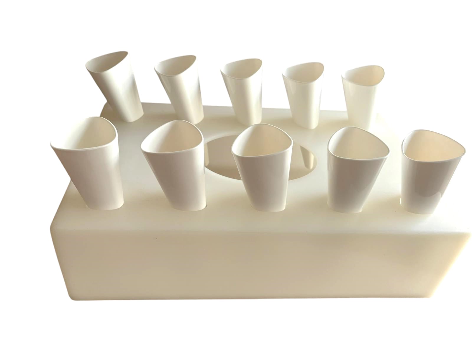 Vassoio galleggiante Ice Glam Wine: Ideale per bollicine e vini, con 6 rientranze per calici in tritan infrangibile da 470 cc, 10 micro fori per finger food e un foro centrale per la bottiglia. Ice Glam Flutes: Pensato per privè e discoteche, con 10 rientranze per flutes bianchi in policarbonato e un foro centrale per la bottiglia.
