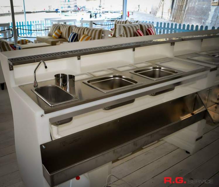 Il Banco Bar con lavandino autonomo è pensato per offrire libertà di installazione, può essere collegato direttamente alla rete idrica oppure funzionare in totale autonomia con lattine di carico e scarico. Questo garantisce un servizio fluido e immediato. Questa caratteristica lo rende dunque ideale per chi ha bisogno di una soluzione veloce e anche pratica, senza lunghe preparazioni.