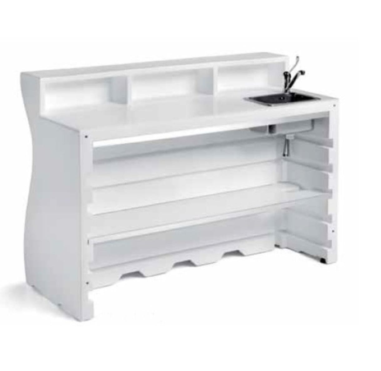 Il Bancone Bar con Lavandino e Rubinetto Bartolomeo di Plust è un modello in polietilene bianco coprente, progettato per offrire massima praticità e resistenza. Grazie alla possibilità di posizionare il lavandino sul lato destro, sul lato sinistro o al centro con un lavello più grande o un lavamani, si adatta perfettamente a ogni esigenza.